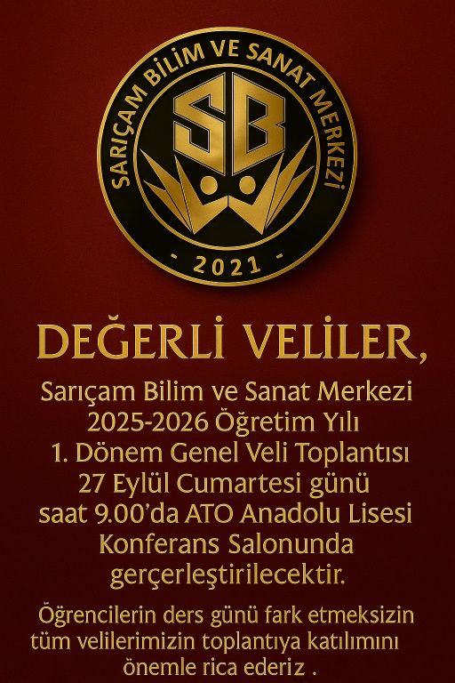 Sarıçam Bilim ve Sanat Merkezi 2025-2026 Öğretim Yılı 1. Dönem Genel Veli Toplantısı 27 Eylül Cumartesi günü saat 9.00'da ATO Anadolu Lisesi Konferans Salonunda gerçekleştirilecektir.